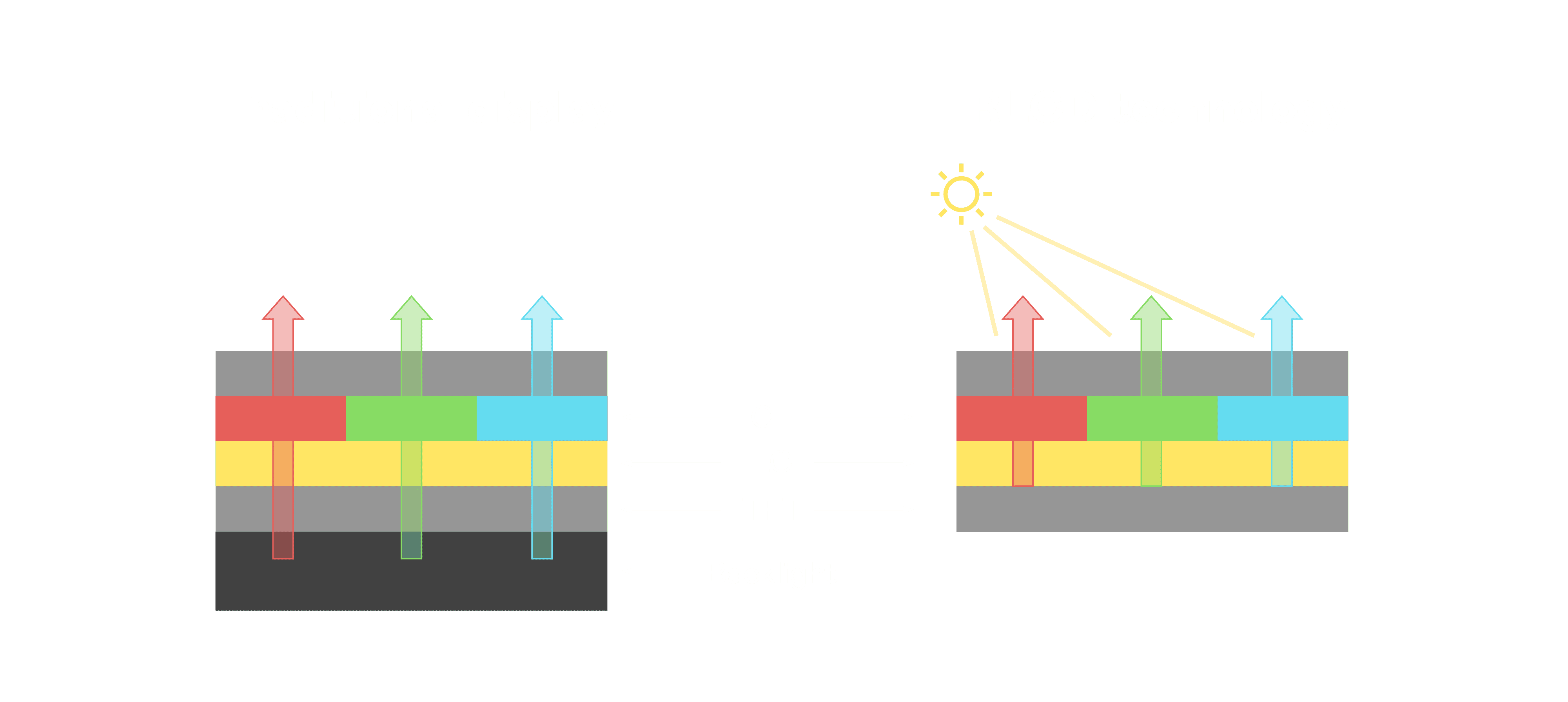 与传统需搭配背光单元的液晶显示相比,,,反射式液晶技术不仅更省电、、、更轻薄,,,且即便在艳阳下仍能清晰显示。。。。此外,,少了背光单元,,也大幅降低了 LED 蓝光伤害眼睛的疑虑。。。。