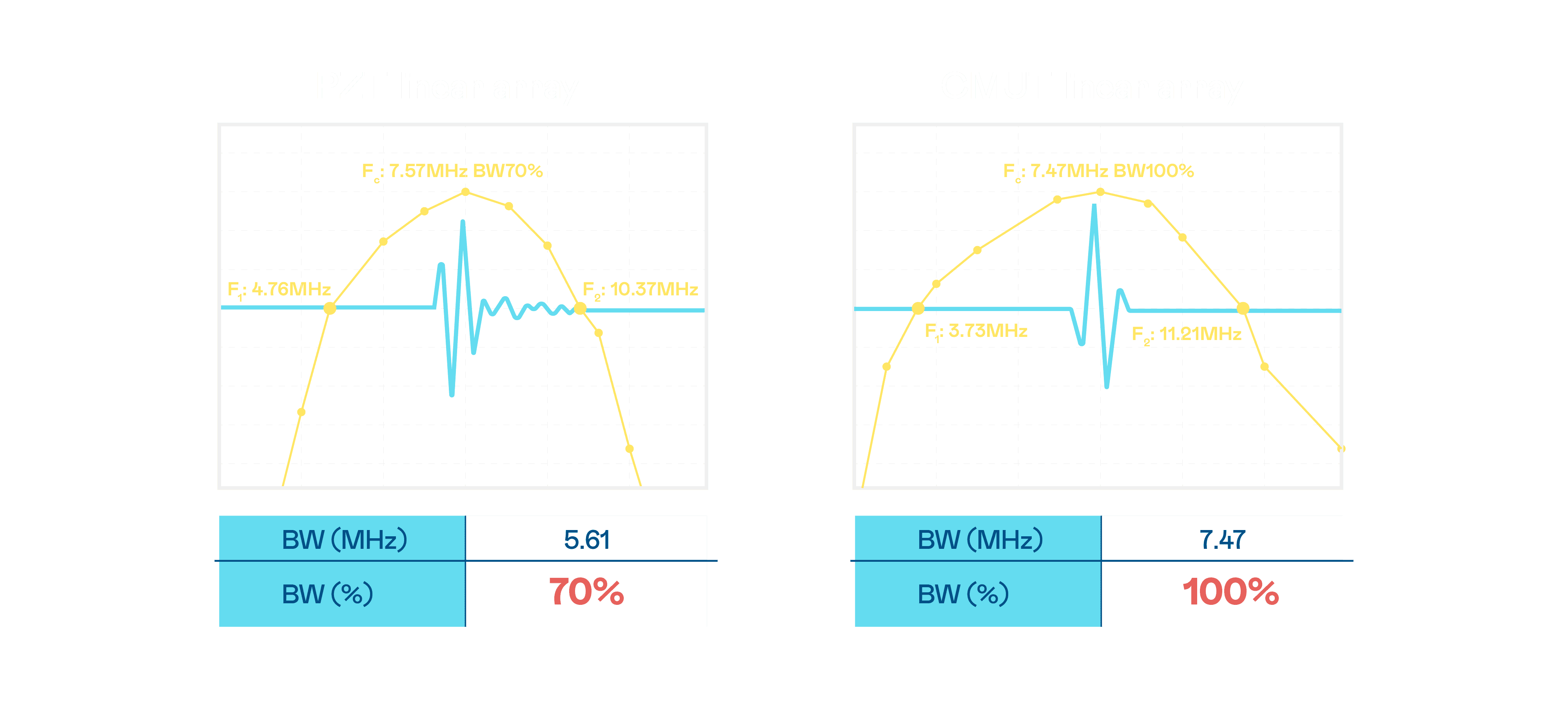 超音波影像的解析度高低,,,首先取决于探头能发出的讯号频宽。。。z6mg·人生就是博 CMUT 可提供高清晰的超音波讯号,,,提供高频宽、、高灵敏度、、、影像纹理细节更高的超音波影像,,协助医护人员缩短影像判读时间及利用精准的医疗影像进行诊断。。